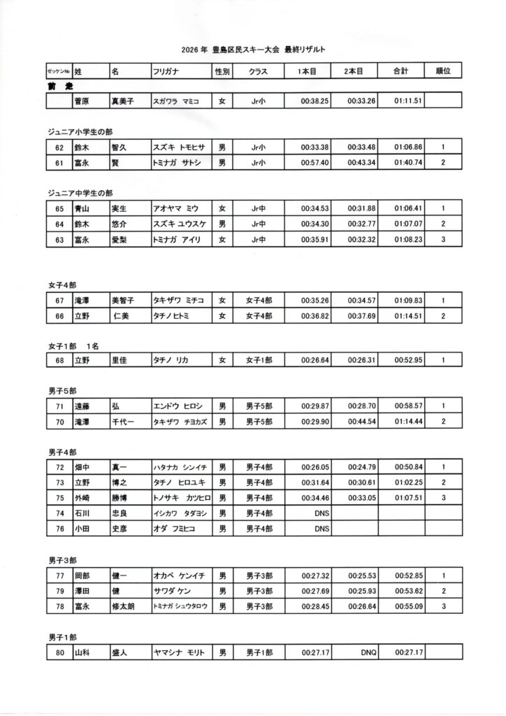 豊島区民大会が開催されました。競技コースの雪不足が心配されましたが、前週から無事にコースオープン。大会前日は良い天気の中、大会に向けての練習会。大会当日は開会式から雲が広がり、時々ガスがかかる天候となりましたが、ジュニアの小学生、中学生からベテラン選手までエントリー18名が参加。1本目、2本目ともに大きく振ったセットではなかったが、選手の皆さんはこれまでの練習の成果を存分に発揮し、果敢に攻めつつ、競技を楽しめたようです。大会終了後の表彰式では各部1位から3位までに賞状、さらにジュニアの部の選手へはメダルも授与。ラップ賞となる豊島区長杯は男子が畑中真一選手、女子は立野里佳選手。ともに昨年に引き続きの獲得となりました。今大会は都民スポーツ大会の選手選考会を兼ねており、成績上位選手の希望者は都民スポーツ大会(3月1日)にエントリー。引き続き本大会でのご健闘を祈念いたします!